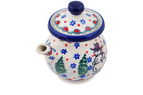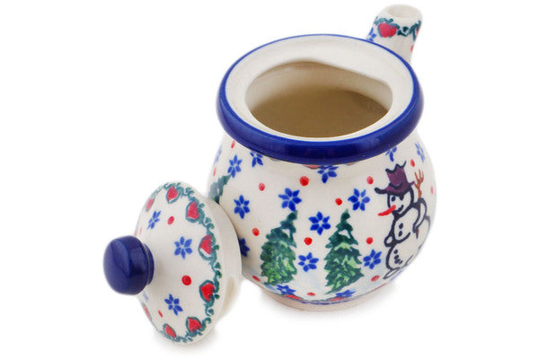 This Polish pottery Creamer with Lid is made by Ceramika Artystyczna workshop in Boleslawiec, Poland. Manufacturer item number H9427Q. It is 3½" high and measures 3¾" by 2¾". The capacity of this Creamer with Lid is 5.1 oz when filled to rim and it weighs 0.3 lbs. The pattern was designed by artist Teresa Liana. It is part of the Dancing Snowman Collection.