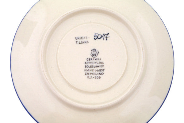 This Polish pottery Cup with Saucer is made by Ceramika Artystyczna workshop in Boleslawiec, Poland. Manufacturer item number H2531Q. It is 3¾" high and measures 5½" by 5½". The capacity of this Cup with Saucer is 4.6 oz when filled to rim and it weighs 0.8 lbs. The pattern was designed by artist MARIA STARZYK. It is part of the Blue Kissed Petals Collection.