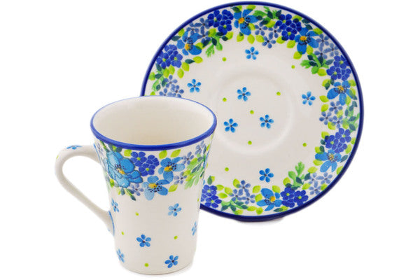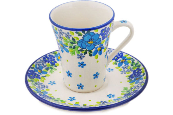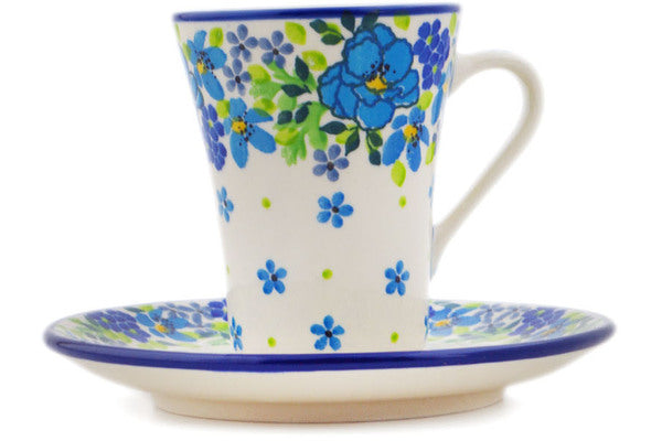 Polish Pottery 5 oz Cup with Saucer Blue Kissed Petals UNIKAT
