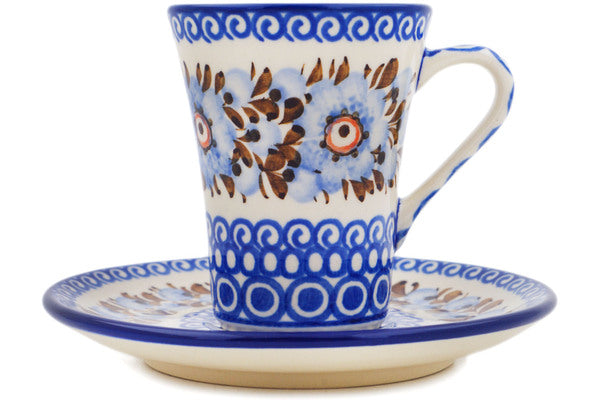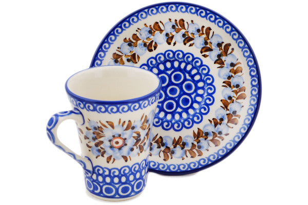 Polish Pottery 5 oz Cup with Saucer Brown And Blue Beauty UNIKAT
