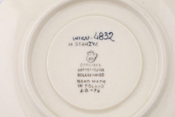 This Polish pottery Cup with Saucer is made by Ceramika Artystyczna workshop in Boleslawiec, Poland. Manufacturer item number H2382Q. It is 3¾" high and measures 5½" by 5½". The capacity of this Cup with Saucer is 4.6 oz when filled to rim and it weighs 0.8 lbs. The pattern was designed by artist Maria Starzyk. It is part of the Soaring Swallows Collection.