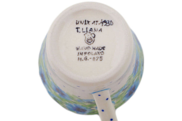 This Polish pottery Cup with Saucer is made by Ceramika Artystyczna workshop in Boleslawiec, Poland. Manufacturer item number H2455Q. It is 3¾" high and measures 5½" by 5½". The capacity of this Cup with Saucer is 4.6 oz when filled to rim and it weighs 0.8 lbs. The pattern was designed by artist TERESA LIANA. It is part of the Springing Into Spring Collection.