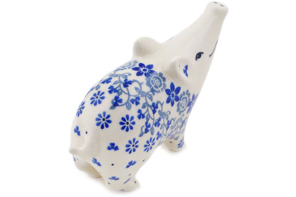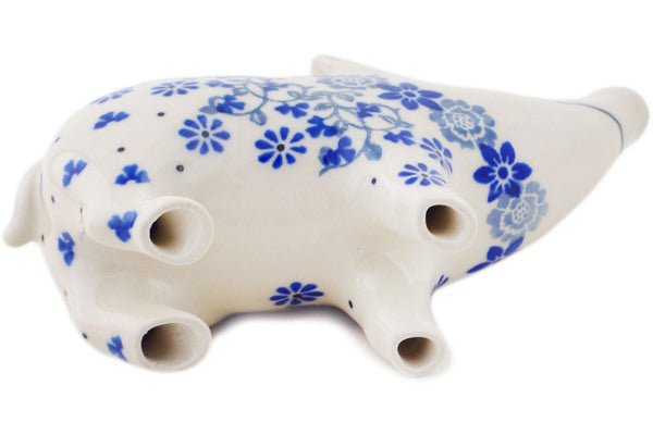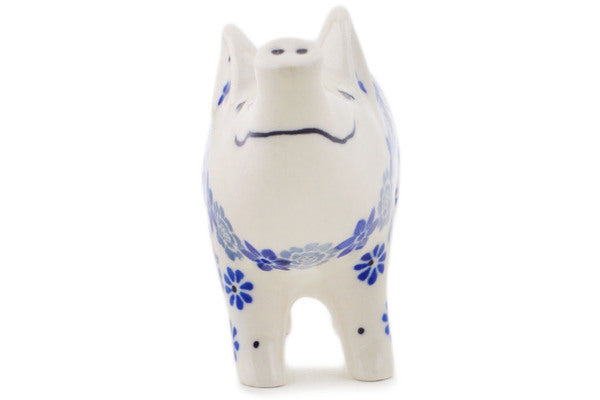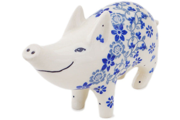 This Polish pottery Pig Figurine is made by Ceramika Artystyczna workshop in Boleslawiec, Poland. Manufacturer item number H0345Q. It is 3¼" high and measures 5¼" by 1¾". The weight of this Pig Figurine is 0.3 lbs. The pattern was designed by artist Maria Starzyk. It is part of the Blue Country Field Collection.