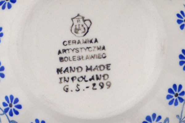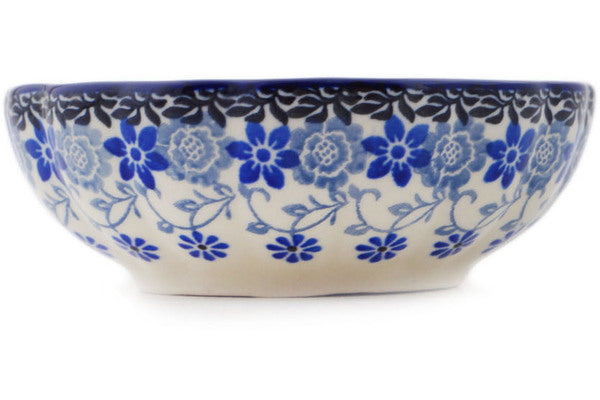 This Polish pottery Scalloped Fluted Bowl is made by Ceramika Artystyczna workshop in Boleslawiec, Poland. Manufacturer item number H5983Q. It is 1½" high and measures 4¾" by 4¾". The capacity of this Scalloped Fluted Bowl is 8.4 oz when filled to rim and it weighs 0.5 lbs. It is part of the First Snow Collection.