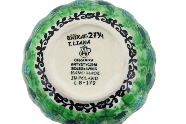 This Polish pottery Scalloped Fluted Bowl is made by Ceramika Artystyczna workshop in Boleslawiec, Poland. Manufacturer item number H2594L. It is 1½" high and measures 4¾" by 4¾". The capacity of this Scalloped Fluted Bowl is 8.4 oz when filled to rim and it weighs 0.5 lbs. The pattern was designed by artist Teresa Liana. It is part of the Mallard Meadow Collection.