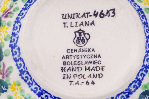 This Polish pottery Scalloped Fluted Bowl is made by Ceramika Artystyczna workshop in Boleslawiec, Poland. Manufacturer item number H6910Q. It is 1½" high and measures 4¾" by 4¾". The capacity of this Scalloped Fluted Bowl is 8.4 oz when filled to rim and it weighs 0.5 lbs. The pattern was designed by artist Teresa Liana. It is part of the Summer Garden Collection.