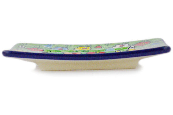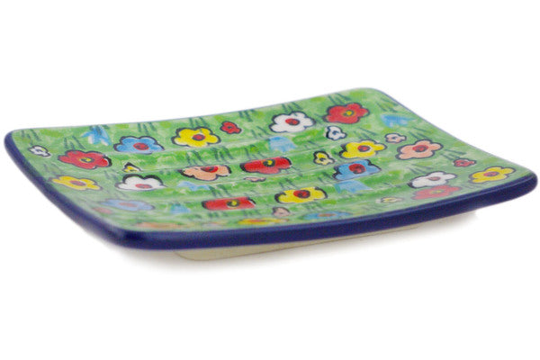 This Polish pottery Soap Dish is made by Ceramika Artystyczna workshop in Boleslawiec, Poland. Manufacturer item number H2939R. It is ½" high and measures 4¾" by 3½". The weight of this Soap Dish is 0.3 lbs. It is part of the Whimsical Garden Collection.