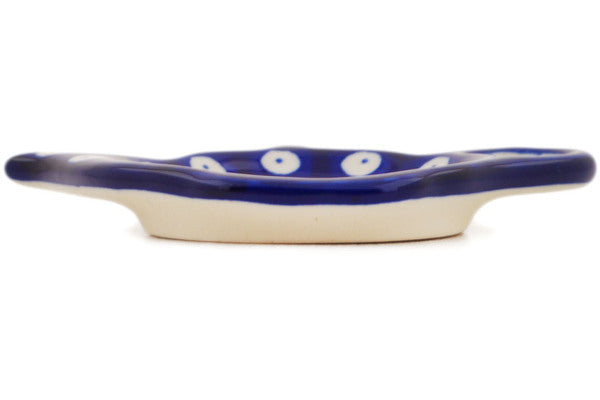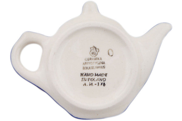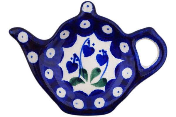 This Polish pottery Tea Bag or Lemon Plate is made by Ceramika Artystyczna workshop in Boleslawiec, Poland. Manufacturer item number H2182J. It is ½" high and measures 4¾" by 3½". The weight of this Tea Bag or Lemon Plate is 0.2 lbs. The pattern was designed by artist Maria Ciszewska. It is part of the Bleeding Heart Peacock Collection.