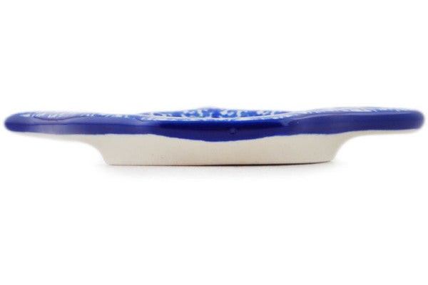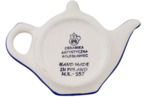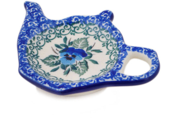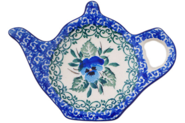 This Polish pottery Tea Bag or Lemon Plate is made by Ceramika Artystyczna workshop in Boleslawiec, Poland. Manufacturer item number H6172Q. It is ½" high and measures 4¾" by 3½". The weight of this Tea Bag or Lemon Plate is 0.2 lbs. It is part of the Blue Pansy Collection.