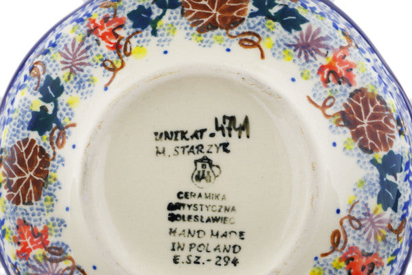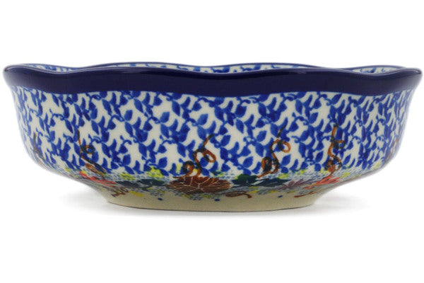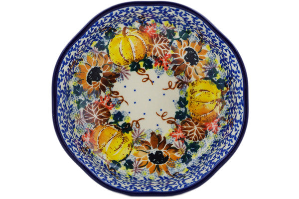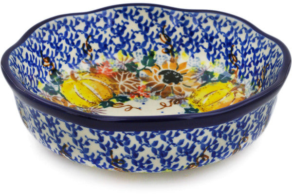 This Polish pottery Scalloped Bowl is made by Ceramika Artystyczna workshop in Boleslawiec, Poland. Manufacturer item number H8625J. It is 2" high and measures 6" by 6". The capacity of this Scalloped Bowl is 13.5 oz when filled to rim and it weighs 0.8 lbs. The pattern was designed by artist Maria Starzyk. It is part of the Autumn Falling Leaves Collection.