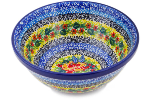 This Polish pottery Bowl is made by Ceramika Artystyczna workshop in Boleslawiec, Poland. Manufacturer item number H0867Q. It is 2¾" high and measures 6½" by 6½". The capacity of this Bowl is 24.0 oz when filled to rim and it weighs 1.2 lbs. The pattern was designed by artist Teresa Liana. It is part of the Copper Rose Meadow Collection.
