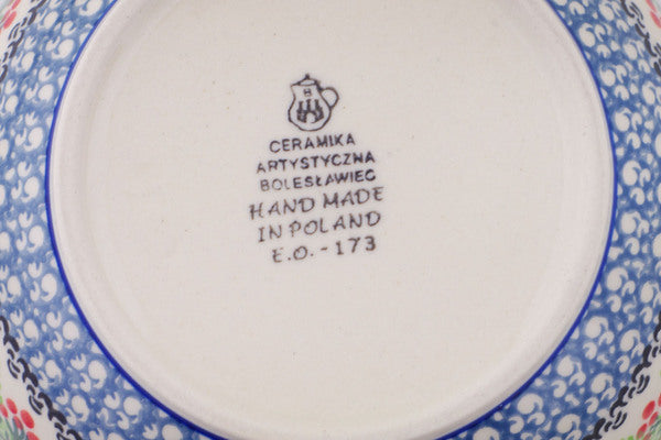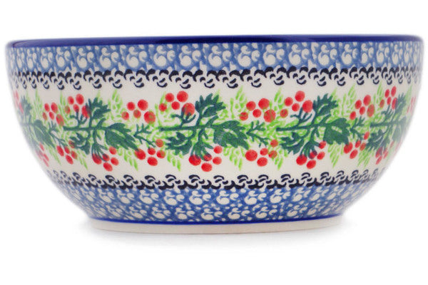This Polish pottery Bowl is made by Ceramika Artystyczna workshop in Boleslawiec, Poland. Manufacturer item number H5247Q. It is 2¾" high and measures 6½" by 6½". The capacity of this Bowl is 27.0 oz when filled to rim and it weighs 1.3 lbs. The pattern was designed by artist Wirginia Cebrowska. It is part of the Holly Berry Wreath Collection.