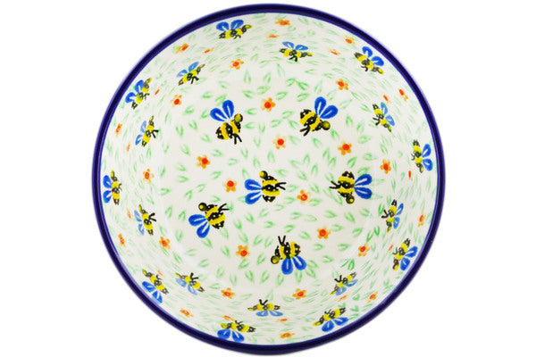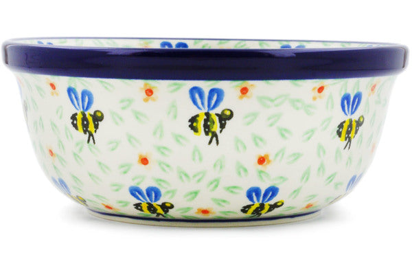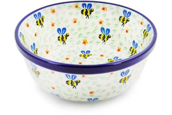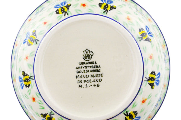 This Polish pottery Bowl is made by Ceramika Artystyczna workshop in Boleslawiec, Poland. Manufacturer item number H3404J. It is 2¾" high and measures 6¼" by 6¼". The capacity of this Bowl is 22.0 oz when filled to rim and it weighs 1.3 lbs. The pattern was designed by artist Jacek Chyla. It is part of the Honey Bee Collection.