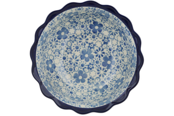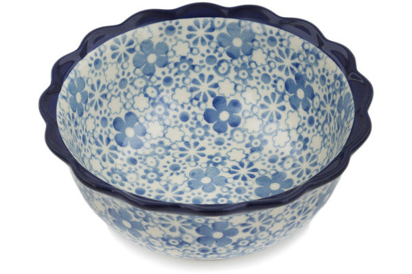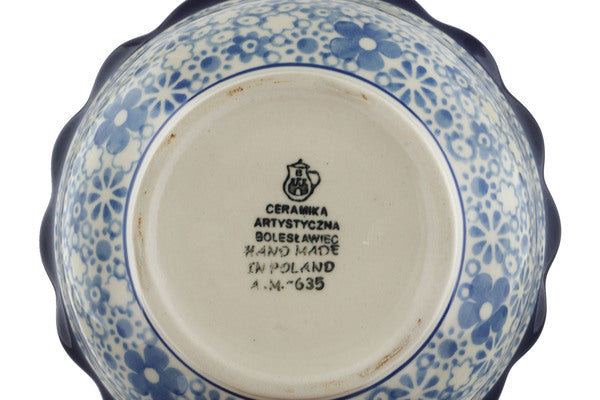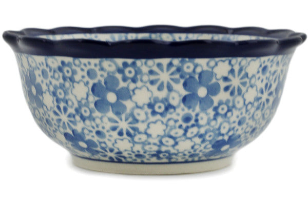 This Polish pottery Scalloped Bowl is made by Ceramika Artystyczna workshop in Boleslawiec, Poland. Manufacturer item number H9333K. It is 2½" high and measures 5¾" by 5¾". The capacity of this Scalloped Bowl is 15.4 oz when filled to rim and it weighs 0.8 lbs. The pattern was designed by artist Maria Starzyk. It is part of the Motley Flowers Collection.