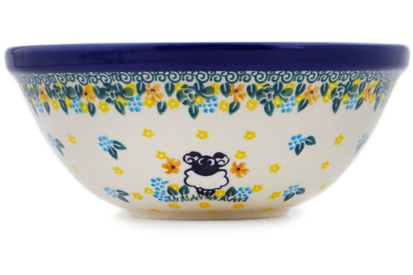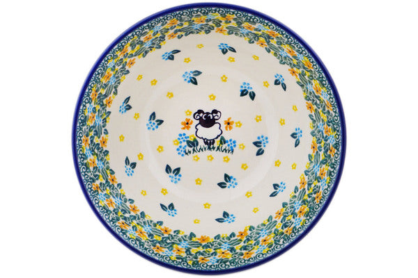 This Polish pottery Bowl is made by Ceramika Artystyczna workshop in Boleslawiec, Poland. Manufacturer item number H9337Q. It is 2¾" high and measures 6½" by 6½". The capacity of this Bowl is 24.0 oz when filled to rim and it weighs 1.2 lbs. It is part of the Sheep In The Meadow Collection.