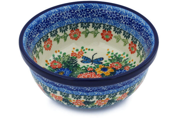 This Polish pottery Bowl is made by Ceramika Artystyczna workshop in Boleslawiec, Poland. Manufacturer item number H7924G. It is 2¾" high and measures 6¼" by 6¼". The capacity of this Bowl is 22.0 oz when filled to rim and it weighs 1.3 lbs. The pattern was designed by artist Teresa Liana. It is part of the Splendid Dragonfly Collection.