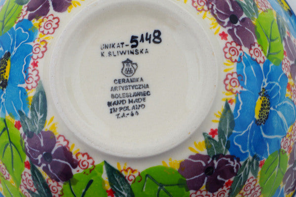 This is a Polish pottery Unikat (Signature) Bowl, which means that it has been hand painted with both sponges and brushes and it is signed by the artist who painted it. Unikat pieces are the most intricate works of art. Larger Unikat items take hours of very careful work to finish.