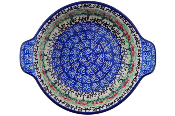 This Polish pottery Bowl with Handles is made by Ceramika Artystyczna workshop in Boleslawiec, Poland. Manufacturer item number H1516Q. It is 2¼" high and measures 6" by 5". The capacity of this Bowl with Handles is 10.8 oz when filled to rim and it weighs 0.7 lbs. The pattern was designed by artist Irena Mączka. It is part of the Maraschino Collection.