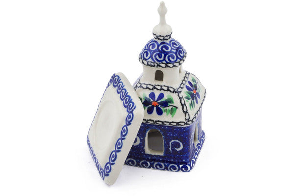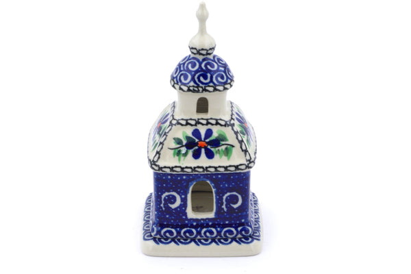 This Polish pottery Chapel Candle Holder is made by Ceramika Artystyczna workshop in Boleslawiec, Poland. Manufacturer item number H7768I. It is 6" high and measures 3" by 3". The weight of this Chapel Candle Holder is 0.6 lbs. The pattern was designed by artist Krystyna Deptuła. It is part of the Blue Daisy Swirls Collection.