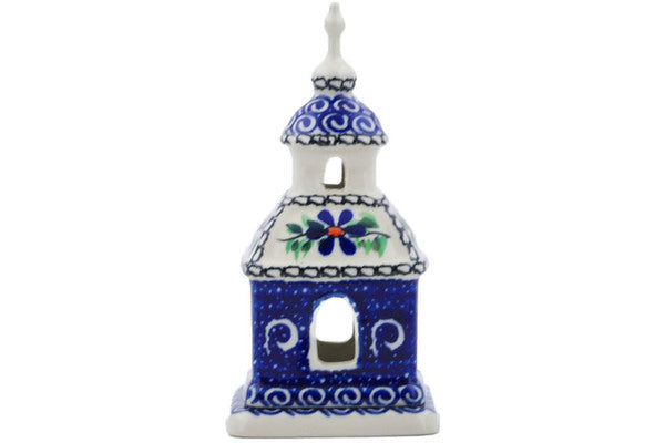Polish Pottery 6" Chapel Candle Holder Blue Daisy Swirls