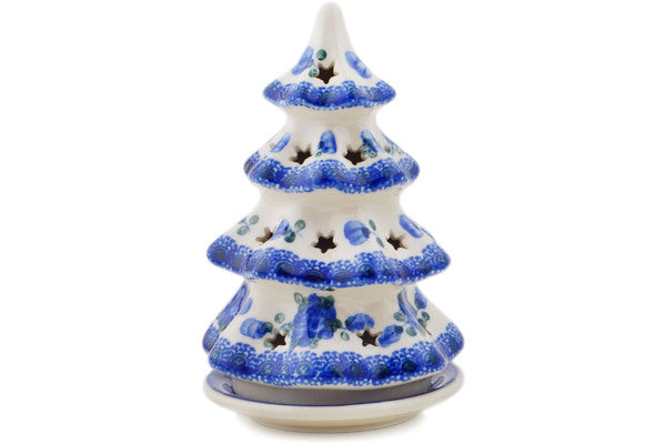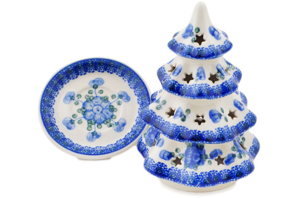 This Polish pottery Christmas Tree Candle Holder is made by Ceramika Artystyczna workshop in Boleslawiec, Poland. Manufacturer item number H2896H. It is 6" high and measures 4" by 4". The weight of this Christmas Tree Candle Holder is 0.9 lbs. The pattern was designed by artist Jolanta Okraska. It is part of the Blue Poppies Collection.