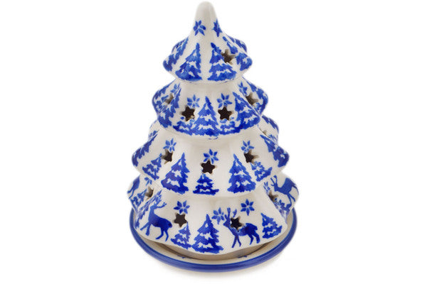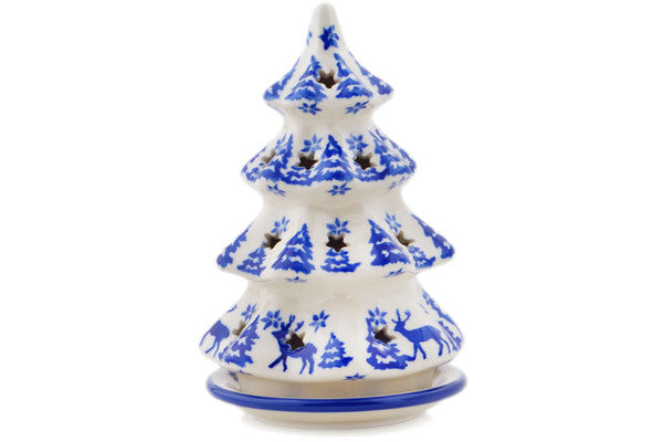 This Polish pottery Christmas Tree Candle Holder is made by Ceramika Artystyczna workshop in Boleslawiec, Poland. Manufacturer item number H4375I. It is 6" high and measures 4" by 4". The weight of this Christmas Tree Candle Holder is 0.9 lbs. The pattern was designed by artist Teresa Liana. It is part of the Winter Deer Collection.