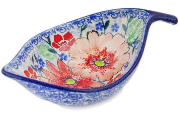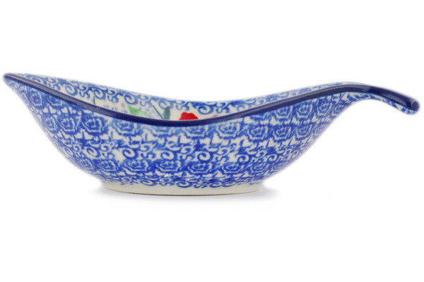 This Polish pottery Condiment Dish is made by Ceramika Artystyczna workshop in Boleslawiec, Poland. Manufacturer item number H7247Q. It is 1¾" high and measures 6" by 3½". The capacity of this Condiment Dish is 2.0 oz when filled to rim and it weighs 0.4 lbs. It is part of the Peak Of Perfection Collection.