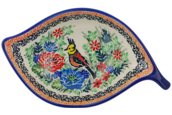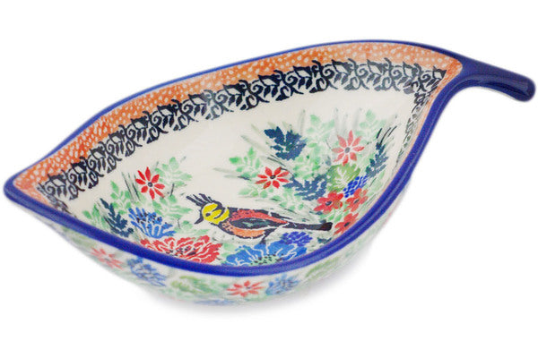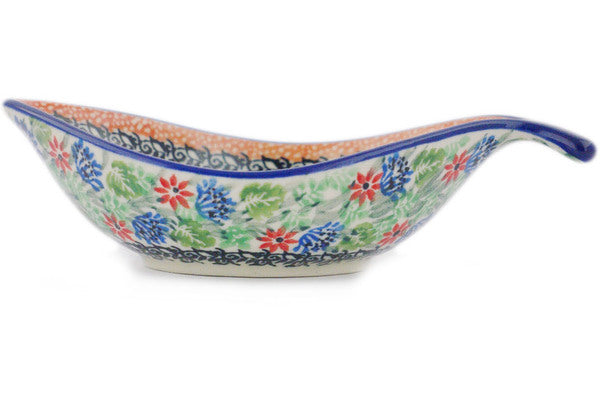 This Polish pottery Condiment Dish is made by Ceramika Artystyczna workshop in Boleslawiec, Poland. Manufacturer item number H7268Q. It is 1¾" high and measures 6" by 3½". The capacity of this Condiment Dish is 2.0 oz when filled to rim and it weighs 0.4 lbs. The pattern was designed by artist Teresa Liana. It is part of the Resting Bird Collection.