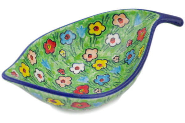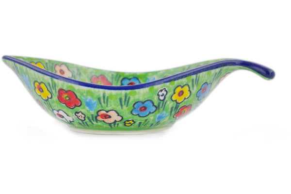 This Polish pottery Condiment Dish is made by Ceramika Artystyczna workshop in Boleslawiec, Poland. Manufacturer item number H7304Q. It is 1¾" high and measures 6" by 3½". The capacity of this Condiment Dish is 2.0 oz when filled to rim and it weighs 0.4 lbs. It is part of the Whimsical Garden Collection.