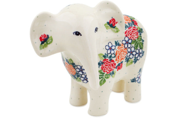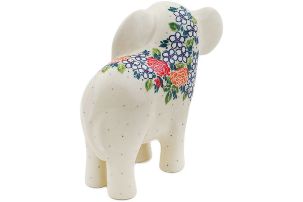 This Polish pottery Elephant Figurine is made by Ceramika Artystyczna workshop in Boleslawiec, Poland. Manufacturer item number H9644P. It is 5½" high and measures 6" by 3½". The weight of this Elephant Figurine is 0.7 lbs. The pattern was designed by artist Maria Starzyk. It is part of the Spring's Arrival Collection.