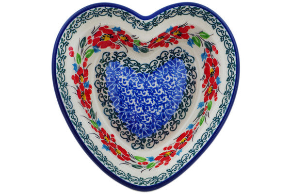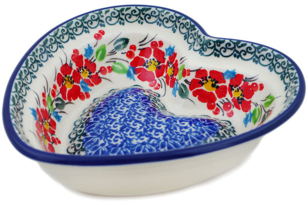 This Polish pottery Heart Shaped Bowl is made by Ceramika Artystyczna workshop in Boleslawiec, Poland. Manufacturer item number H3049P. It is 1½" high and measures 5¾" by 5½". The capacity of this Heart Shaped Bowl is 7.1 oz when filled to rim and it weighs 0.6 lbs. It is part of the Cherry Colored Florals Collection.