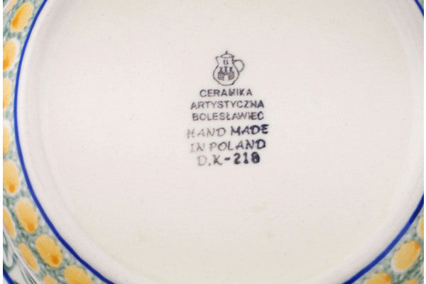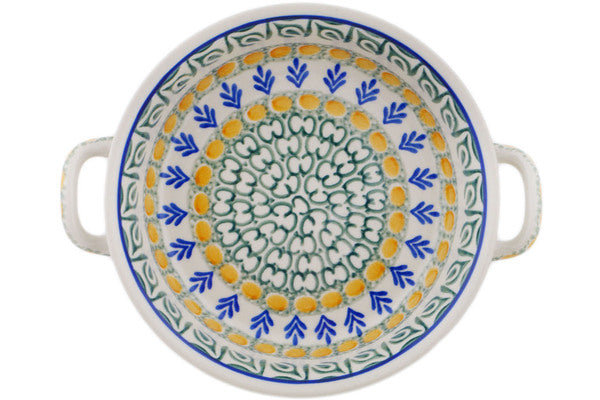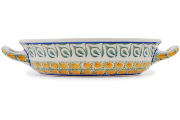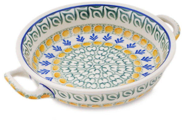 This Polish pottery Round Baker with Handles is made by Ceramika Artystyczna workshop in Boleslawiec, Poland. Manufacturer item number H5367Q. It is 1¾" high and measures 8¼" by 6¾". The capacity of this Round Baker with Handles is 17.2 oz when filled to rim and it weighs 1.1 lbs. The pattern was designed by artist Anna Pasierbiewicz. It is part of the Autumn Wheatfields Collection.