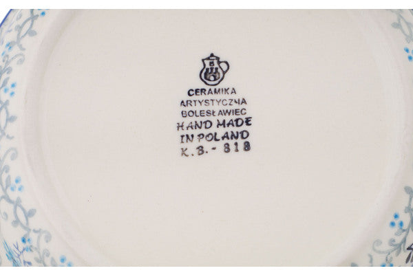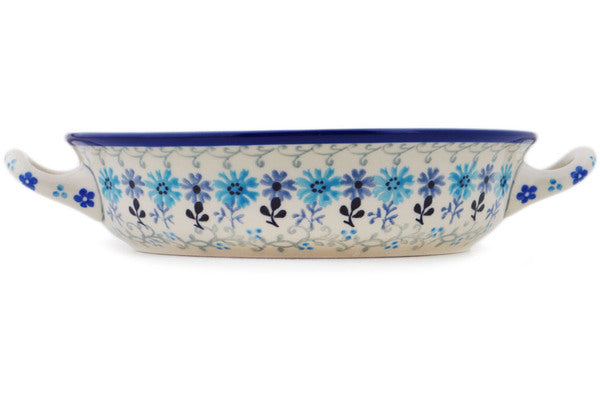 This Polish pottery Round Baker with Handles is made by Ceramika Artystyczna workshop in Boleslawiec, Poland. Manufacturer item number H6454Q. It is 1¾" high and measures 8¼" by 6¾". The capacity of this Round Baker with Handles is 17.2 oz when filled to rim and it weighs 1.1 lbs. It is part of the Baby Blue Garden Collection.