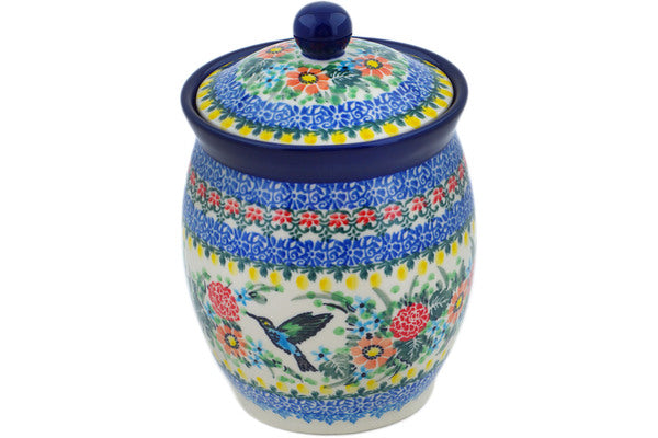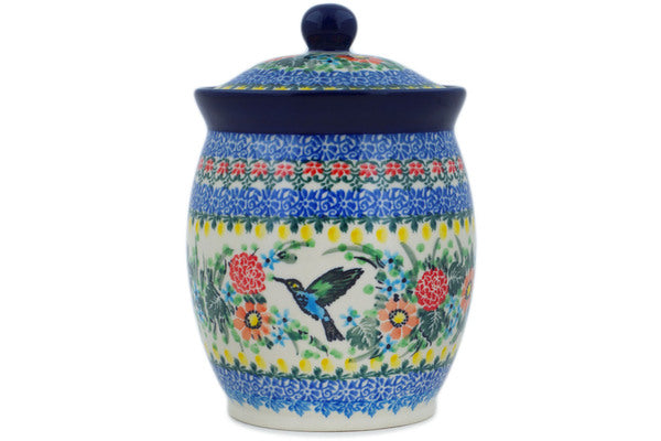 This Polish pottery Jar with Lid is made by Ceramika Artystyczna workshop in Boleslawiec, Poland. Manufacturer item number H5064O. It is 6½" high and measures 4½" by 4½". The capacity of this Jar with Lid is 28.7 oz when filled to rim and it weighs 1.3 lbs. The pattern was designed by artist Teresa Liana. It is part of the Solo Hummingbird Collection.