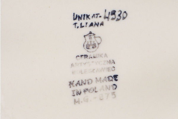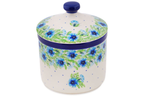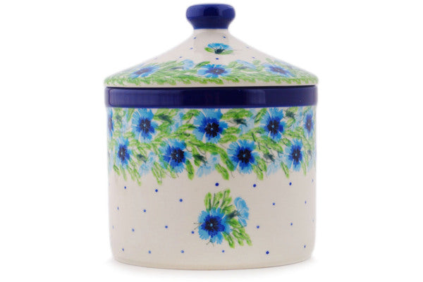 This Polish pottery Jar with Lid is made by Ceramika Artystyczna workshop in Boleslawiec, Poland. Manufacturer item number H2454Q. It is 6" high and measures 5" by 5". The capacity of this Jar with Lid is 29.1 oz when filled to rim and it weighs 2.0 lbs. The pattern was designed by artist TERESA LIANA. It is part of the Springing Into Spring Collection.