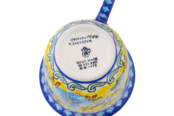 This Polish pottery Cup is made by Ceramika Artystyczna workshop in Boleslawiec, Poland. Manufacturer item number H9495O. It is 2¾" high and measures 4½" by 3½". The capacity of this Cup is 6.0 oz when filled to rim and it weighs 0.5 lbs. The pattern was designed by artist Krystyna Dacyszyn. It is part of the Brilliant In Blue Collection.