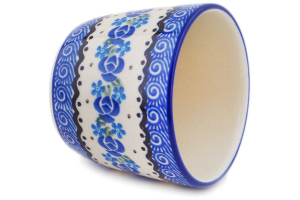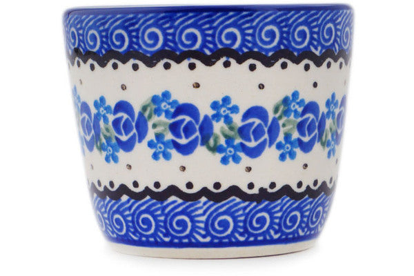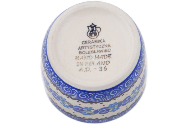 This Polish pottery Tumbler is made by Ceramika Artystyczna workshop in Boleslawiec, Poland. Manufacturer item number H9543Q. It is 2½" high and measures 3¼" by 3¼". The capacity of this Tumbler is 6.1 oz when filled to rim and it weighs 0.4 lbs. The pattern was designed by artist Maria Starzyk. It is part of the Blue Bud Sea Collection.