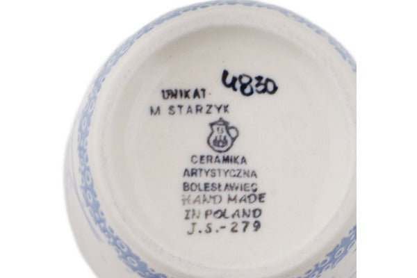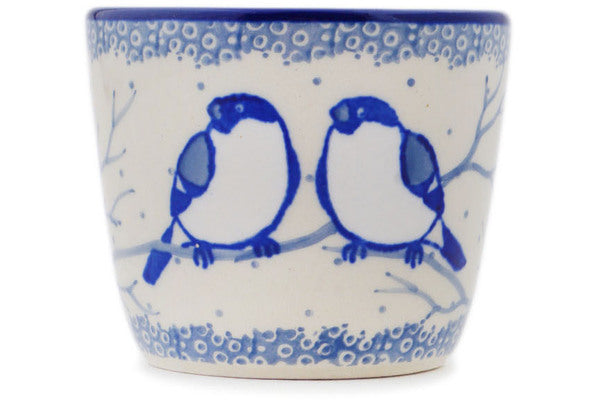 This Polish pottery Tumbler is made by Ceramika Artystyczna workshop in Boleslawiec, Poland. Manufacturer item number H9436Q. It is 2½" high and measures 3¼" by 3¼". The capacity of this Tumbler is 6.1 oz when filled to rim and it weighs 0.4 lbs. The pattern was designed by artist Maria Starzyk. It is part of the Waiting Birds Collection.