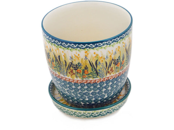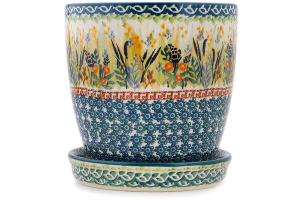 This Polish pottery Planter is made by Ceramika Artystyczna workshop in Boleslawiec, Poland. Manufacturer item number H3802Q. It is 6" high and measures 5¾" by 5¼". The weight of this Planter is 2.9 lbs. The pattern was designed by artist Krystyna Dacyszyn. It is part of the Harvest Collection.