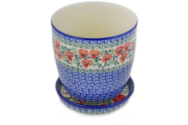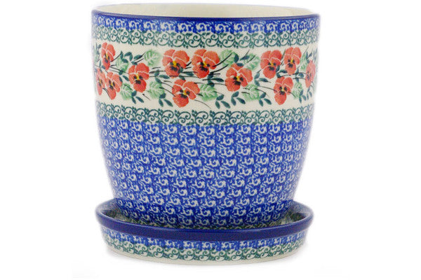 This Polish pottery Planter is made by Ceramika Artystyczna workshop in Boleslawiec, Poland. Manufacturer item number H9920Q. It is 6" high and measures 5¾" by 5¼". The weight of this Planter is 2.9 lbs. It is part of the Red Pansy Collection.