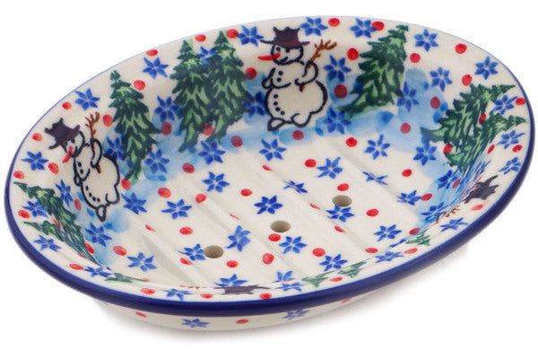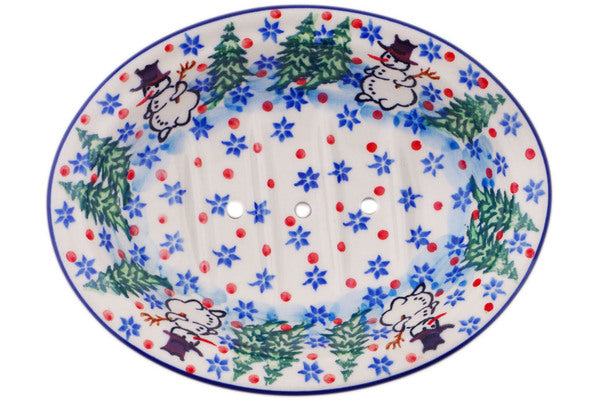 This Polish pottery Soap Dish is made by Ceramika Artystyczna workshop in Boleslawiec, Poland. Manufacturer item number H9411Q. It is 1½" high and measures 5¾" by 4¼". The weight of this Soap Dish is 0.5 lbs. The pattern was designed by artist Teresa Liana. It is part of the Dancing Snowman Collection.