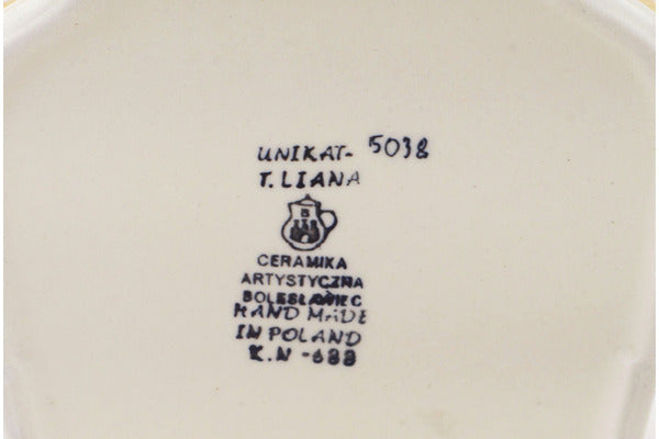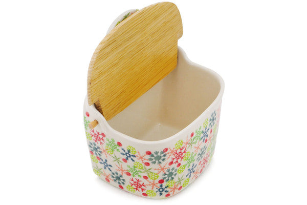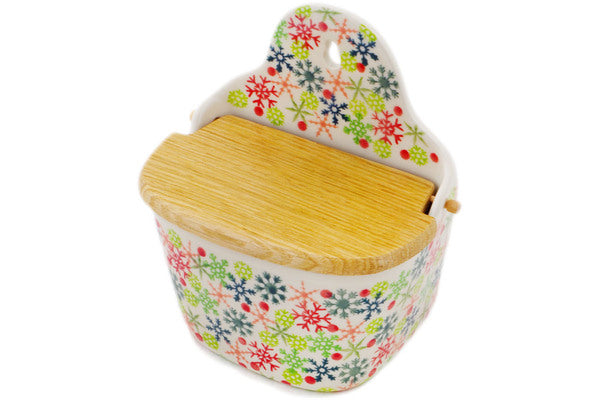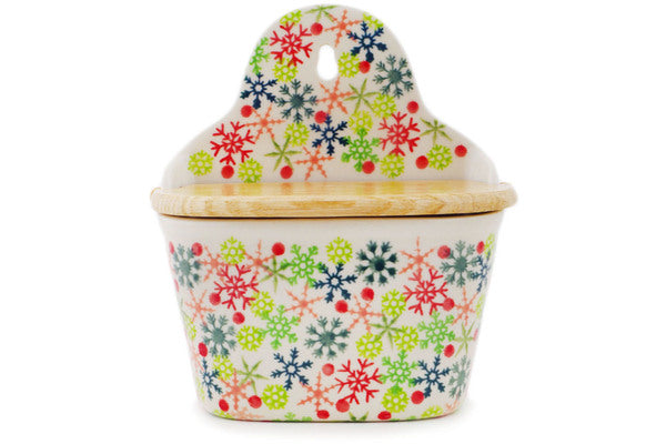 This Polish pottery Wall Jar is made by Ceramika Artystyczna workshop in Boleslawiec, Poland. Manufacturer item number H2559Q. It is 6¼" high and measures 5" by 3½". The capacity of this Wall Jar is 13.5 oz when filled to rim and it weighs 1.6 lbs. It is part of the Holly Jolly Collection.