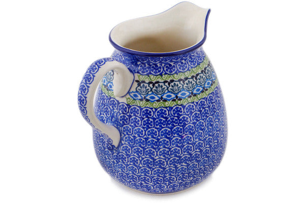 This Polish pottery Pitcher is made by Ceramika Artystyczna workshop in Boleslawiec, Poland. Manufacturer item number H5680Q. It is 7" high and measures 8¼" by 7". The capacity of this Pitcher is 67.6 oz when filled to rim and it weighs 2.5 lbs. The pattern was designed by artist Maria Starzyk. It is part of the Artistic Boho Collection.