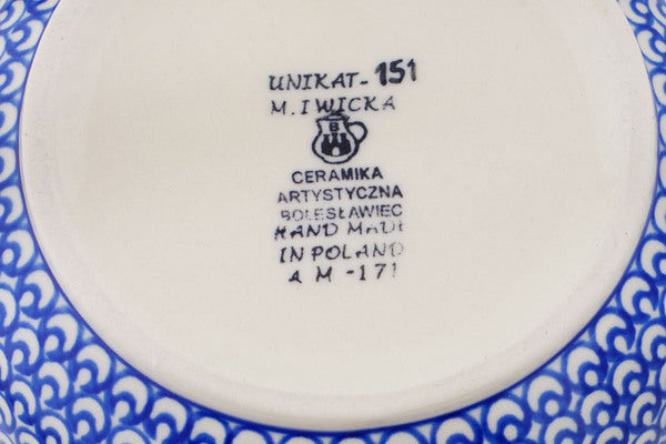 This Polish pottery Pitcher is made by Ceramika Artystyczna workshop in Boleslawiec, Poland. Manufacturer item number H6566Q. It is 7" high and measures 8¼" by 7". The capacity of this Pitcher is 67.6 oz when filled to rim and it weighs 2.5 lbs. The pattern was designed by artist Maria Iwicka. It is part of the Mardi Gras Collection.
