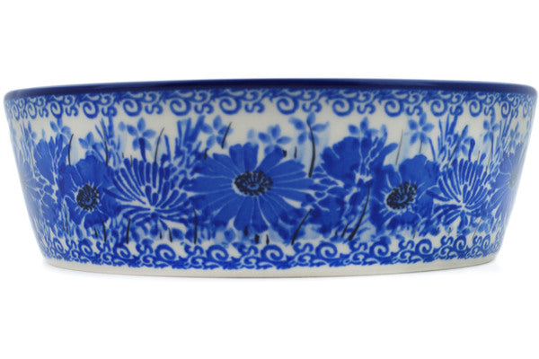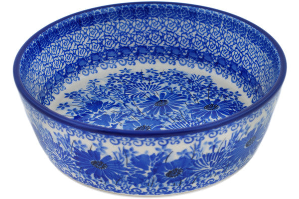 This Polish pottery Bowl is made by Ceramika Artystyczna workshop in Boleslawiec, Poland. Manufacturer item number H7681N. It is 2¼" high and measures 6¾" by 6¾". The capacity of this Bowl is 24.1 oz when filled to rim and it weighs 1.3 lbs. The pattern was designed by artist MARIA STARZYK. It is part of the Dreams In Blue Collection.