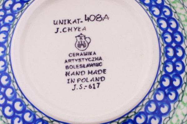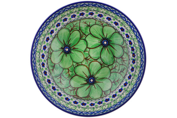 This Polish pottery Bowl is made by Ceramika Artystyczna workshop in Boleslawiec, Poland. Manufacturer item number H6814Q. It is 2¼" high and measures 6¾" by 6¾". The capacity of this Bowl is 21.6 oz when filled to rim and it weighs 1.1 lbs. The pattern was designed by artist Jacek Chyla. It is part of the Green Pansies Collection.