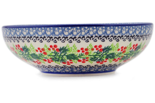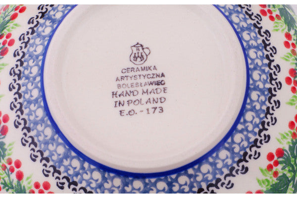 This Polish pottery Bowl is made by Ceramika Artystyczna workshop in Boleslawiec, Poland. Manufacturer item number H5304Q. It is 2¼" high and measures 6¾" by 6¾". The capacity of this Bowl is 21.6 oz when filled to rim and it weighs 1.1 lbs. The pattern was designed by artist Wirginia Cebrowska. It is part of the Holly Berry Wreath Collection.