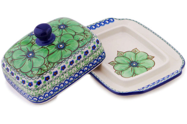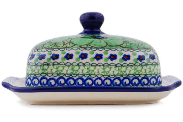 This Polish pottery Butter Dish is made by Ceramika Artystyczna workshop in Boleslawiec, Poland. Manufacturer item number H6808Q. It is 3½" high and measures 6¾" by 5". The weight of this Butter Dish is 1.4 lbs. The pattern was designed by artist Jacek Chyla. It is part of the Green Pansies Collection.