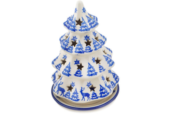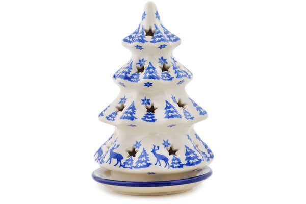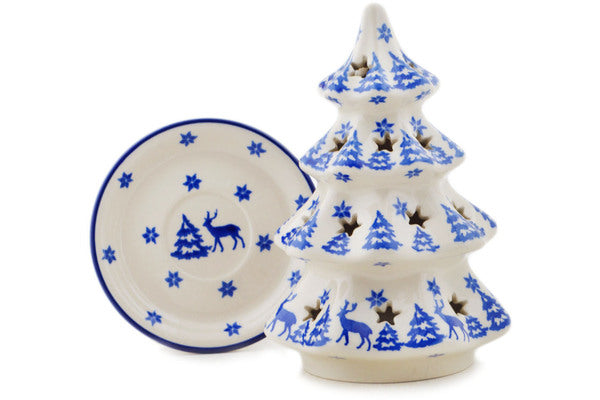 This Polish pottery Christmas Tree Candle Holder is made by Ceramika Artystyczna workshop in Boleslawiec, Poland. Manufacturer item number H4372I. It is 7" high and measures 4½" by 4½". The weight of this Christmas Tree Candle Holder is 1.1 lbs. The pattern was designed by artist Teresa Liana. It is part of the Winter Deer Collection.