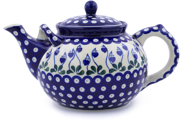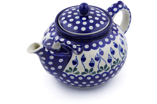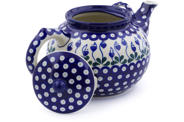 This Polish pottery Tea or Coffee Pot is made by Ceramika Artystyczna workshop in Boleslawiec, Poland. Manufacturer item number H1212J. It is 6¾" high and measures 11" by 7¼". The capacity of this Tea or Coffee Pot is 60.8 oz when filled to rim and it weighs 2.7 lbs. The pattern was designed by artist Maria Ciszewska. It is part of the Bleeding Heart Peacock Collection.